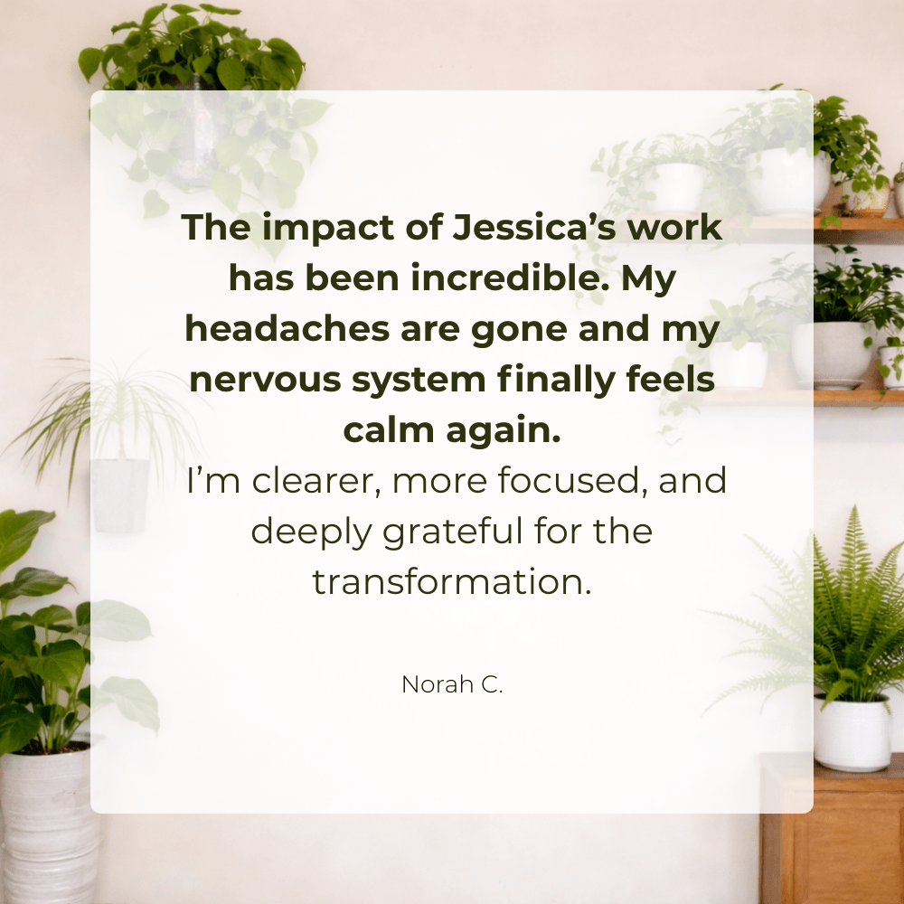 “The overall impact of Jessica’s work on my health has been considerable: fewer headaches, freedom from medication, and a deeply relaxed nervous system. I am incredibly grateful to Jessica.”